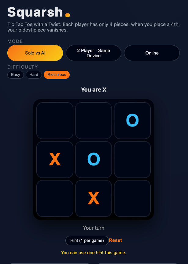 (function () { var cells = Array.from(document.querySelectorAll("#tic-tac-toe-game .ttt-cell")); var statusEl = document.getElementById("ttt-status"); var resetBtn = document.getElementById("ttt-reset"); var currentPlayer = "X"; var board = ["", "", "", "", "", "", "", "", ""]; var gameOver = false; var moveHistory = { X: [], O: [] }; var winningCombos = [ [0,1,2],[3,4,5],[6,7,8], [0,3,6],[1,4,7],[2,5,8], [0,4,8],[2,4,6] ]; function setStatus(msg) { statusEl.textContent = msg; } function handleCellClick(e) { var cell = e.currentTarget; var index = parseInt(cell.getAttribute("data-index")); if (gameOver || board[index] !== "") return; board[index] = currentPlayer; cell.textContent = currentPlayer; moveHistory[currentPlayer].push(index); if (moveHistory[currentPlayer].length > 3) { var oldest = moveHistory[currentPlayer].shift(); board[oldest] = ""; cells[oldest].textContent = ""; cells[oldest].classList.remove("win"); } cells.forEach(c => c.classList.remove("win")); if (checkWin(currentPlayer)) { gameOver = true; setStatus("Player " + currentPlayer + " wins!"); highlightWinningCells(currentPlayer); disableBoard(); return; } currentPlayer = currentPlayer === "X" ? "O" : "X"; setStatus("Player " + currentPlayer + "'s turn"); } function checkWin(player) { return winningCombos.some(combo => combo.every(i => board[i] === player) ); } function highlightWinningCells(player) { winningCombos.forEach(combo => { if (combo.every(i => board[i] === player)) { combo.forEach(i => cells[i].classList.add("win")); } }); } function disableBoard() { cells.forEach(c => c.classList.add("disabled")); } function resetGame() { board.fill(""); moveHistory.X = []; moveHistory.O = []; currentPlayer = "X"; gameOver = false; cells.forEach(c => { c.textContent = ""; c.classList.remove("disabled", "win"); }); setStatus("Player X's turn"); } cells.forEach(c => c.addEventListener("click", handleCellClick)); resetBtn.addEventListener("click", resetGame); })();